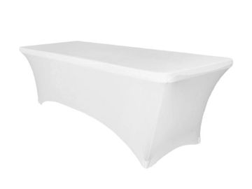 White spandex linens are available for 60” round tables, 6-foot rectangle tables. And 8-foot rectangle tables